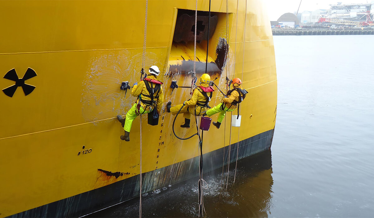 gemi yüzeylerinde temizlik, raspa, boya ve bakım çalışmalarının iskele, vinç veya platform kurulumuna gerek kalmadan güvenli ve ekonomik şekilde uygulanmasını sağlar. Tüm çalışmalar, IRATA / SPRAT uluslararası standartları ve İş Sağlığı ve Güvenliği mevzuatına uygun olarak sertifikalı ve deneyimli personel tarafından yürütülür.